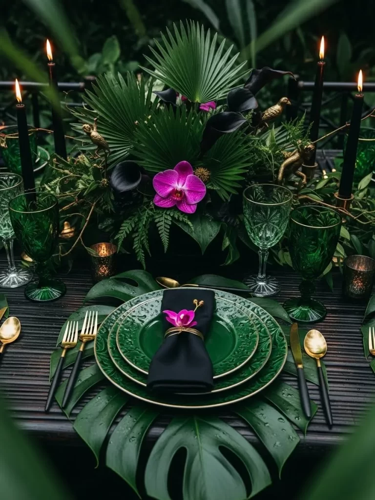 Warm orange tones and desert plants create a dry and sunny mood. This table uses many small cactus plants in clay pots. Gold painted stones and white crystals add a touch of sparkle. Terracotta plates are paired with matching napkins. Amber glasses and copper cutlery complete the warm color theme. This design is excellent for a relaxed desert dinner.
