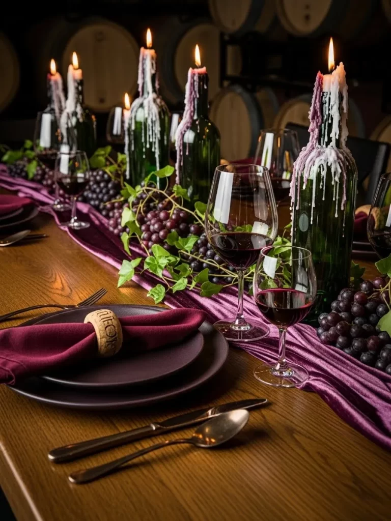 Dark wood and purple velvet create a rich and moody atmosphere. Wine bottles are used as candle holders with purple wax dripping down. Large bunches of dark grapes trail across the table. Deep purple napkins are held by rings made of wine corks. Red wine in large glasses adds to the dark and romantic theme. This setup is excellent for a wine lover.