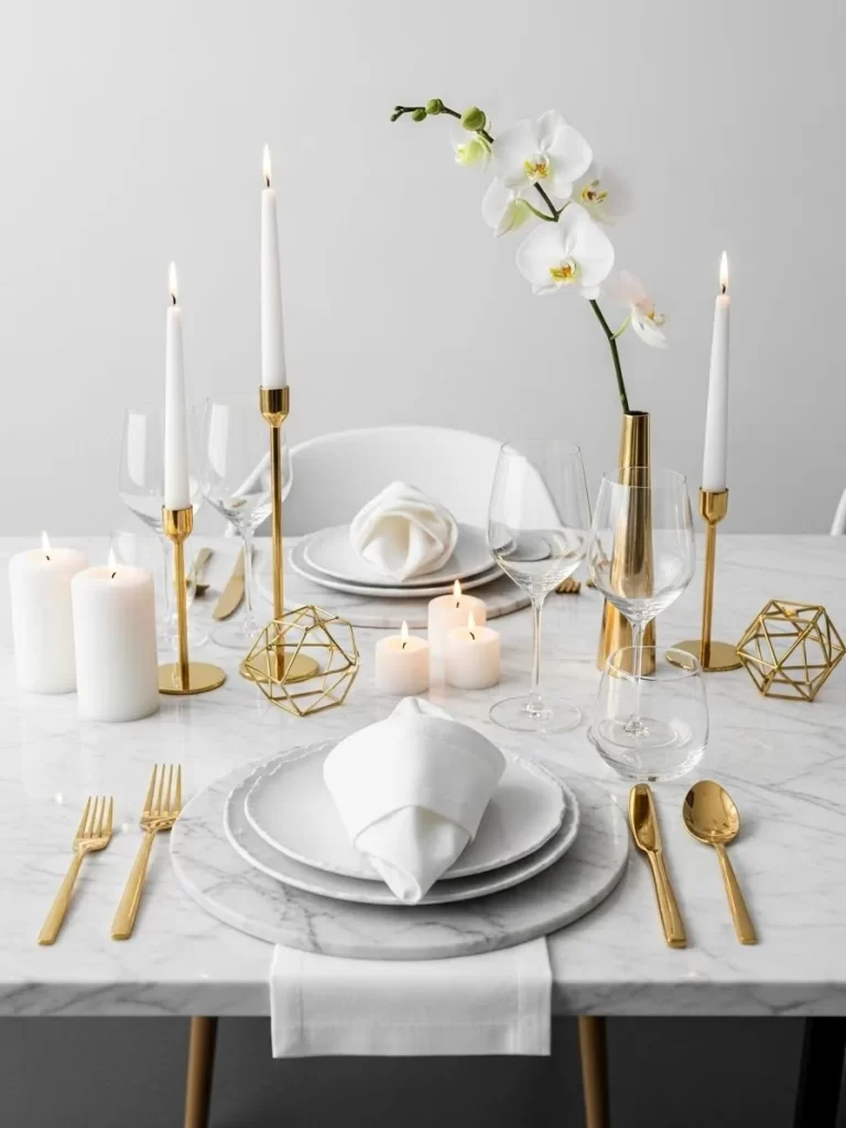 Clean white surfaces offer a high-end look for modern couples. Marble chargers provide a heavy and expensive base for each seat. A single white orchid stands tall in a slim golden vase. White pillar candles of different heights add a soft flicker. Golden geometric shapes are scattered to give the table a 3D effect. This layout stays simple but looks very professional.