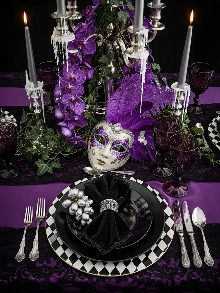 Dramatic purple silk meets black lace for a mysterious evening. A white mask with tall feathers serves as a stunning centerpiece. Tall silver candelabras hold grey candles with flowing white wax. Checkered black and white plates add a playful pop to the dark table. Silver grapes and ivy vines wind around the base of the decor. This style is excellent for a themed Valentine’s dinner.