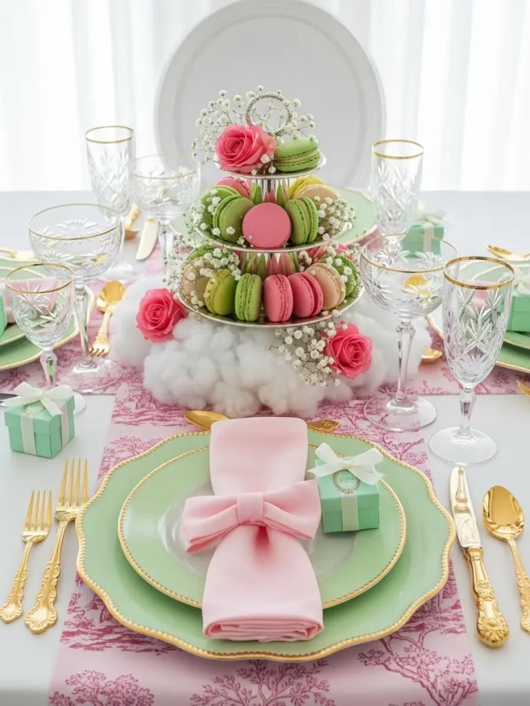 Soft pink shades create a gentle and sweet atmosphere. This setting uses light fabrics to build a dreamy texture. White and pink flowers spread across the center to add a natural scent. Cream ribbons are tied into large bows on every plate. Small heart-shaped dishes hold a single berry for a cute touch. Golden cutlery adds a hint of luxury to the pastel palette.