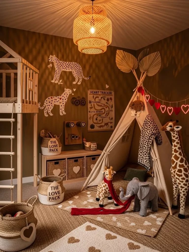 Heart shaped fruit decals and colorful bird toys add a festive touch. Woven baskets hold binoculars and maps for the next big safari trip. This active theme is great for kids who love animals and exploring nature.