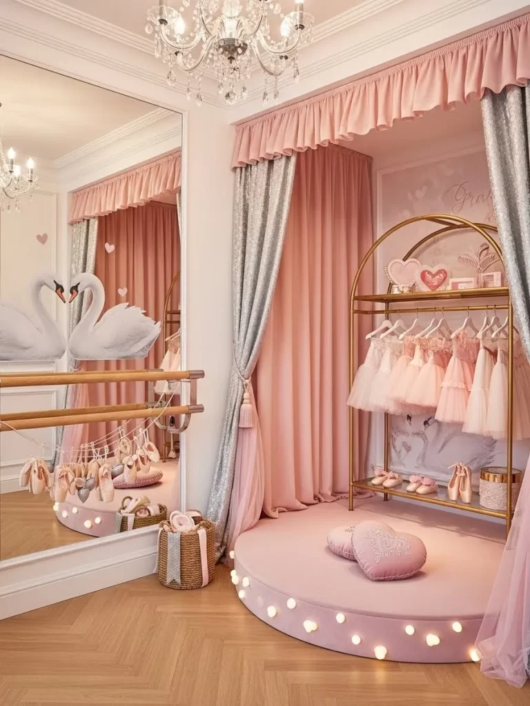 Circus posters and animal decals with heart balloons decorate the walls. Bright primary colors and sparkling lights make the room feel like a party. This area is perfect for kids who love to perform and stay active.