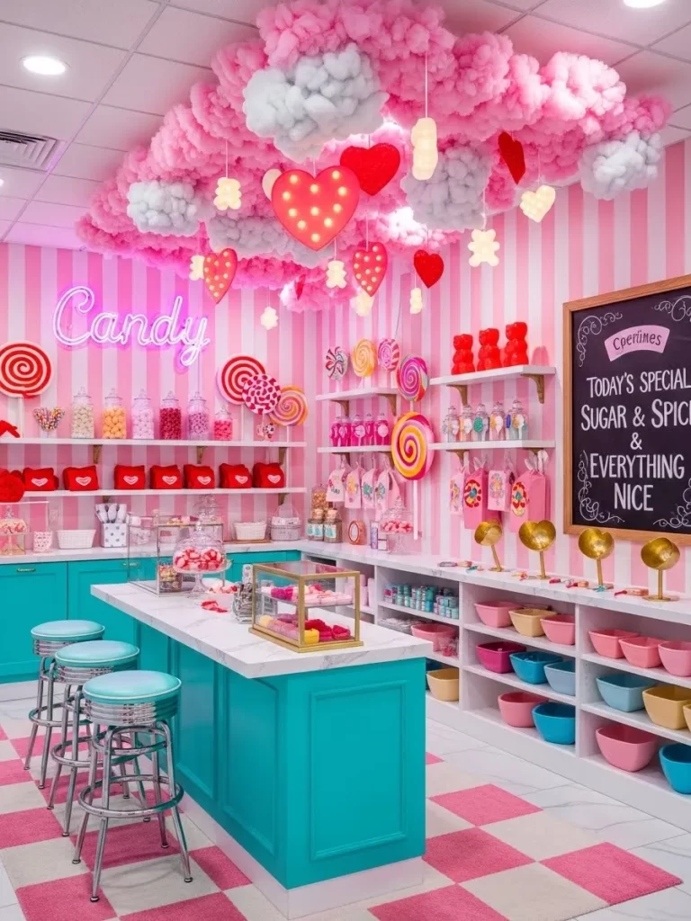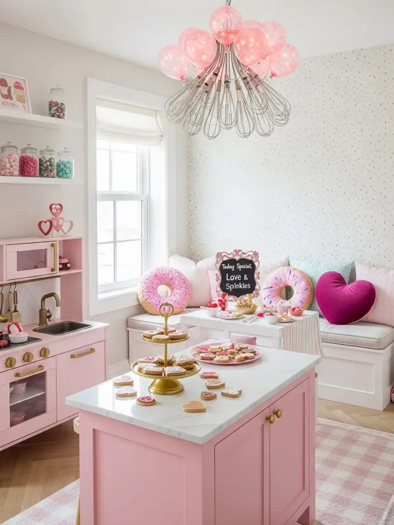 Shelves are lined with jars of colorful candies and baking supplies to spark creativity. Large donut pillows and heart cushions offer a cozy spot to sit. A whisk chandelier with pink balloon lights adds a playful glow to the room.