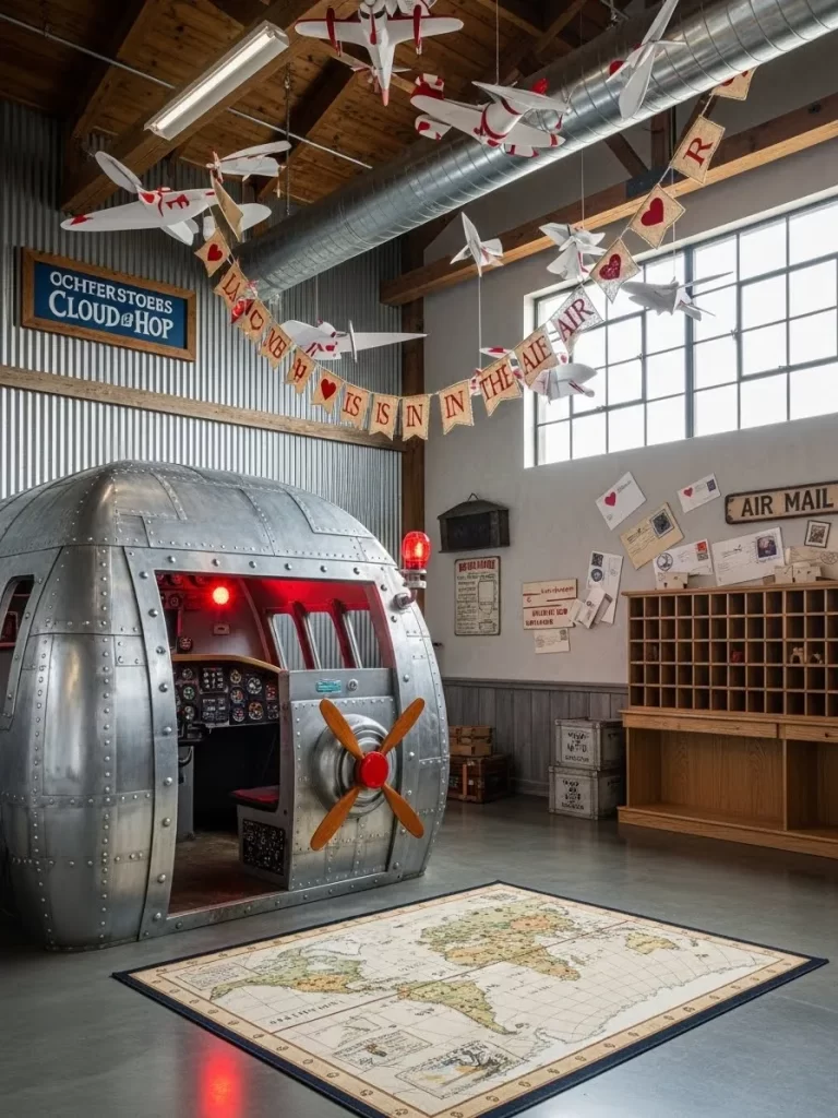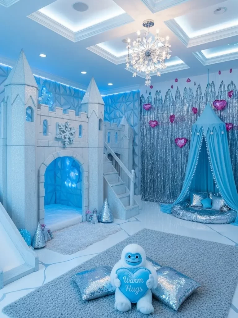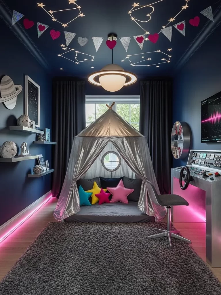 Silver metallic chairs and blue LED lights create a high tech atmosphere. Star shaped pillows and planet decals make the space feel like a real galaxy. This room is great for kids who love science, technology, and adventure.