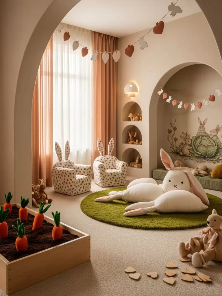 - Soft lighting and cozy textures make a playroom feel inviting during the winter months.