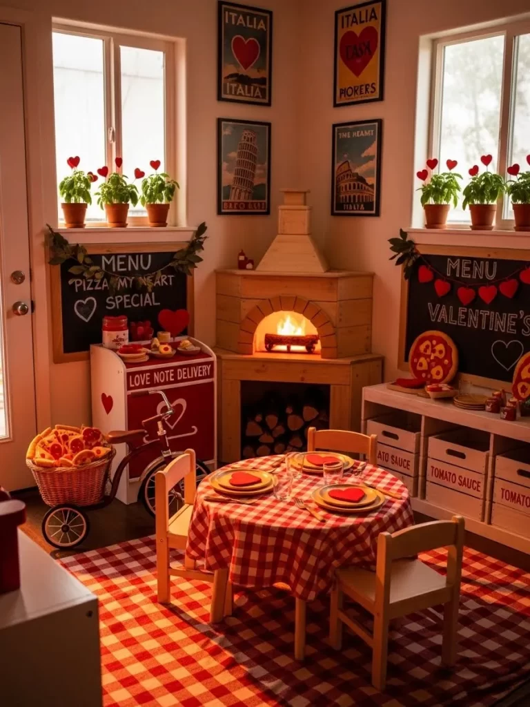 Small wooden tables are set with heart shaped plates and felt pizza toppings. Chalkboard signs display the daily specials and seasonal love notes. Baskets full of toy pizza slices sit ready for delivery on a small tricycle.