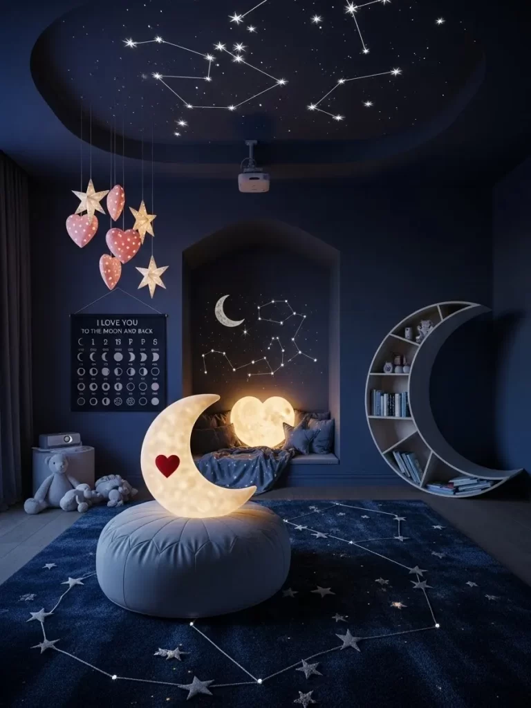 Journey to the edge of the universe in this space themed playroom. A massive moon mural covers the wall with glowing heart stars. A futuristic desk with screens and buttons serves as the mission control center.