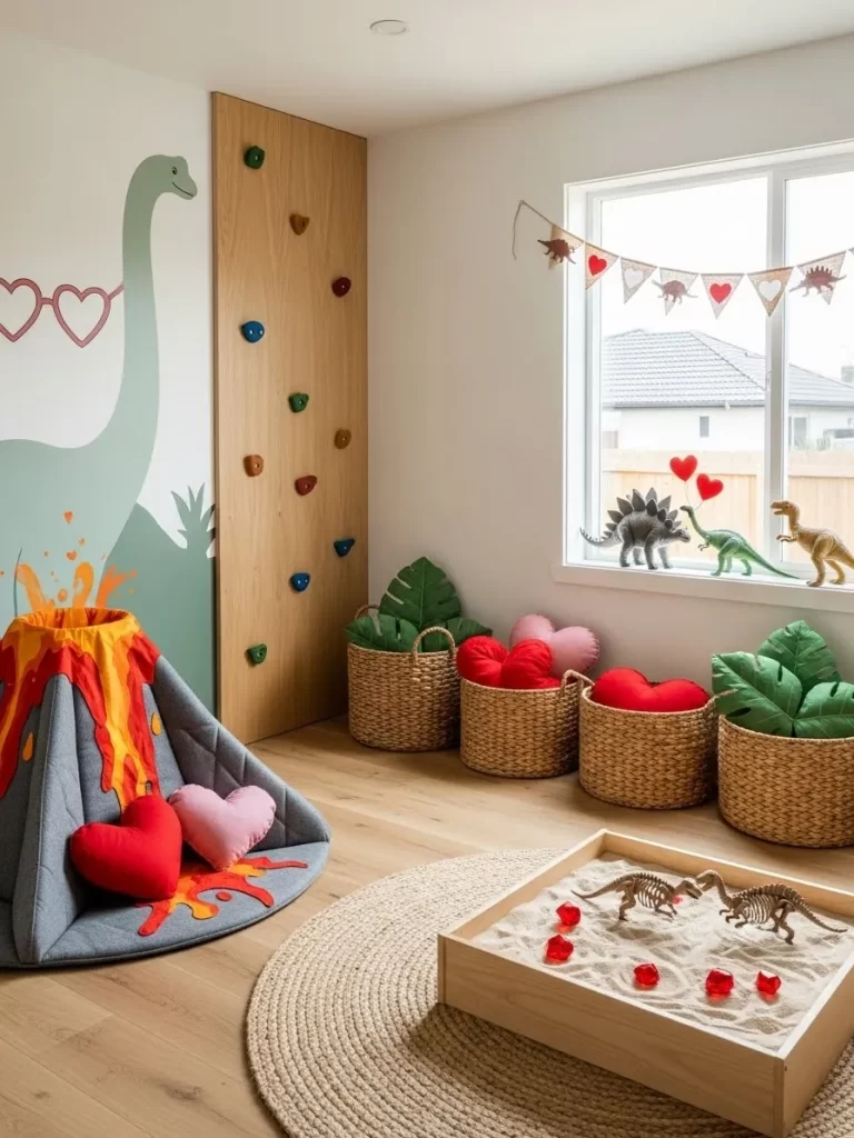 Large dinosaur murals and a wooden climbing wall encourage active play. Tiny toy dinosaurs on the windowsill hold heart balloons to join the celebration. A sandbox tray on the floor lets kids dig for fossils and treasures.