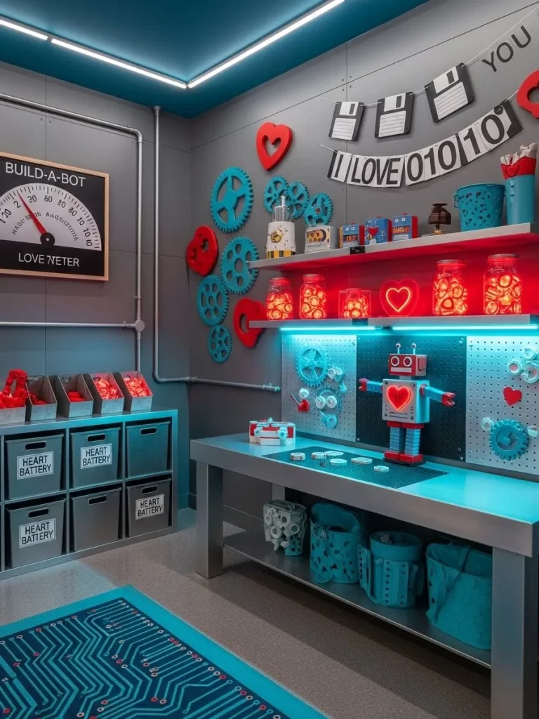 Build your own mechanical friends in this fun robot themed playroom. A large metal workbench with a pegboard holds all the robot parts. Gears, bolts, and heart shapes decorate the walls in an industrial pattern.