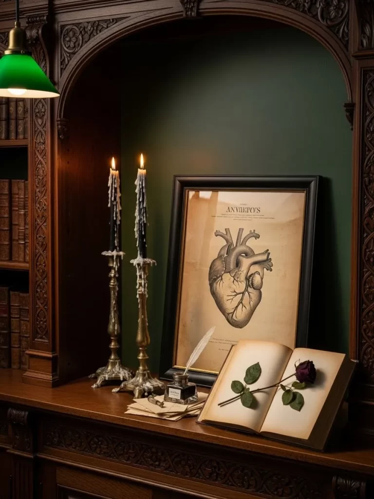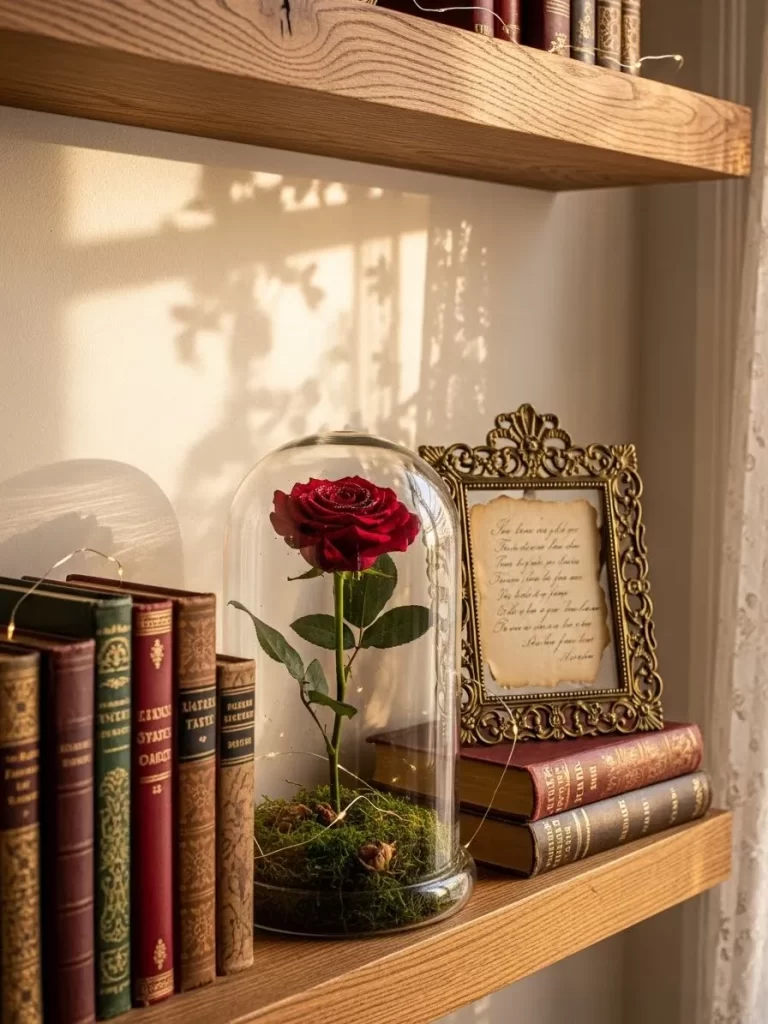 Ornate gold frames hold handwritten notes nearby to enhance the vintage aesthetic. Old leather bound books sit stacked together to provide height and texture. Twinkling fairy lights wrap around the cloche to give the whole shelf a warm romantic glow. These elements combine to create a nostalgic atmosphere that feels both cozy and elegant.