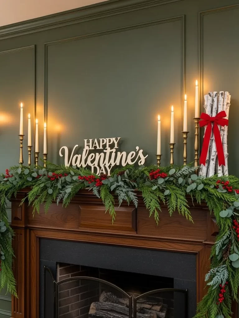 Red berries are woven throughout the greenery for a festive pop of color. In the center sits a wooden cutout sign that reads Happy Valentines Day. On the far right a bundle of white birch logs is tied with a bright red ribbon.