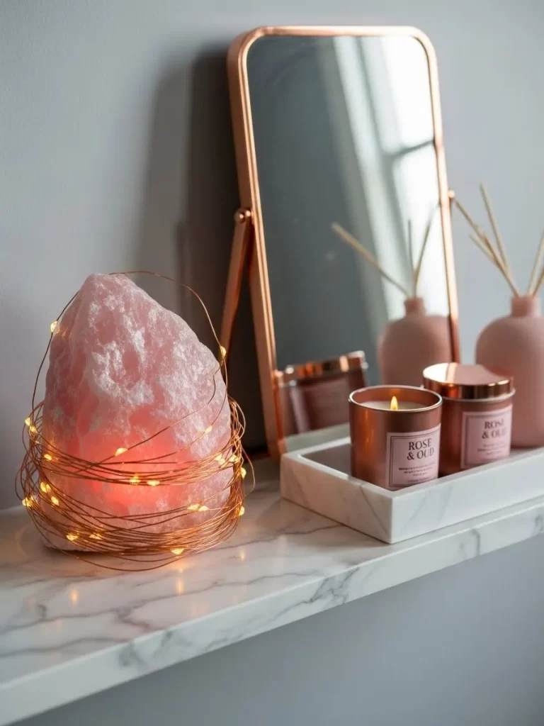 Everything is arranged on a white stone tile for a clean look. The soft pink wall makes the bathroom feel like a luxury spa. This is a great way to remind yourself to relax.