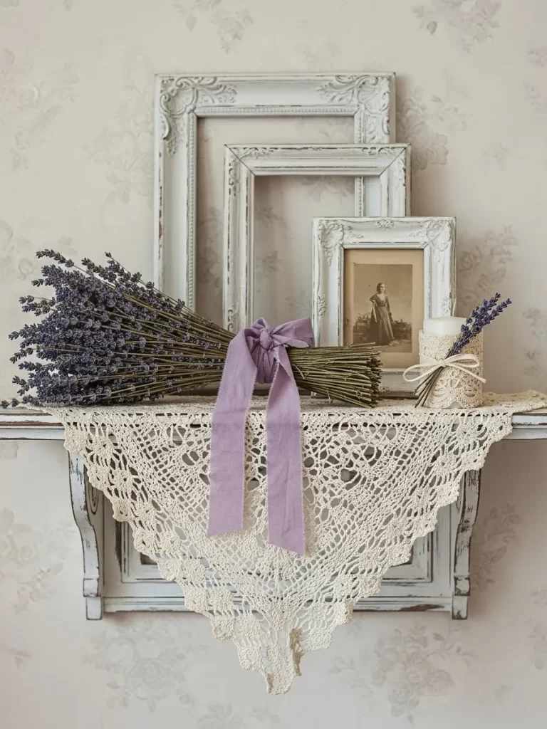 - Attach the burlap banner to the front face of the wooden mantel using small nails or adhesive hooks.