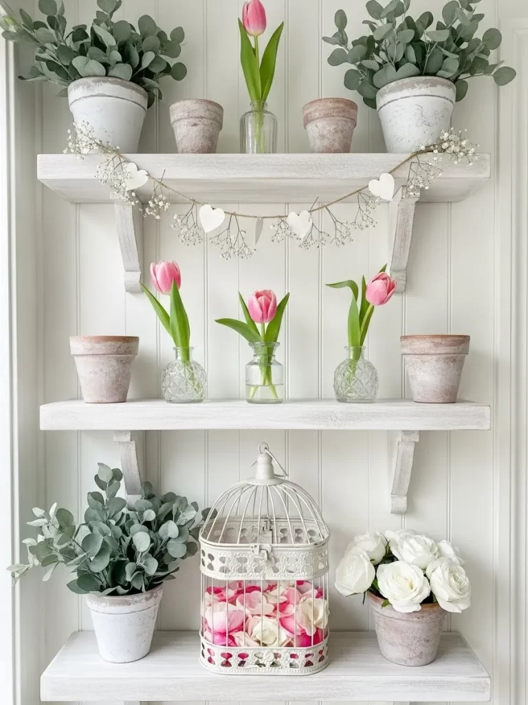 White shelves against a beadboard wall create a bright backdrop for spring decor. Terracotta pots with a distinctive whitewashed finish hold lush green eucalyptus plants. Small glass vases display single pink tulips to add pops of fresh color. A delicate babys breath garland with paper heart cutouts hangs across the middle shelf.