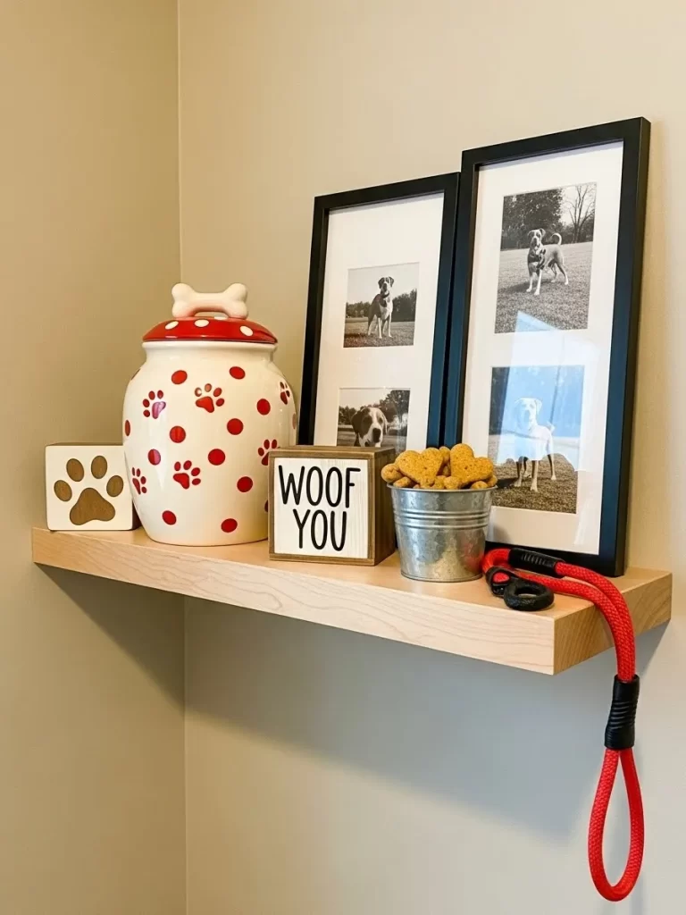 A white jar with red paw prints and a bone lid sits on a wood shelf. Two black frames hold photos of a pet dog in a grassy field. A small wooden block says WOOF YOU in black letters.