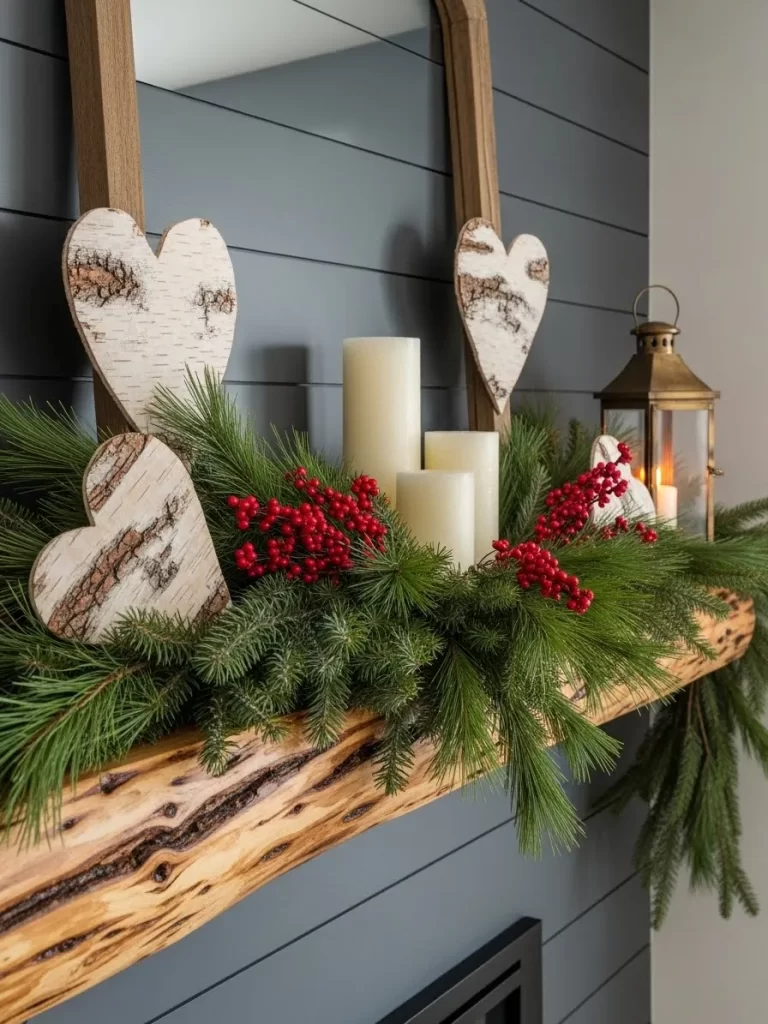 A thick garland of pine needles and red berries sits on a rustic wood mantel. Three large white candles of different heights glow in the center. Hearts made of birch bark hang from a mirror frame above the greenery.