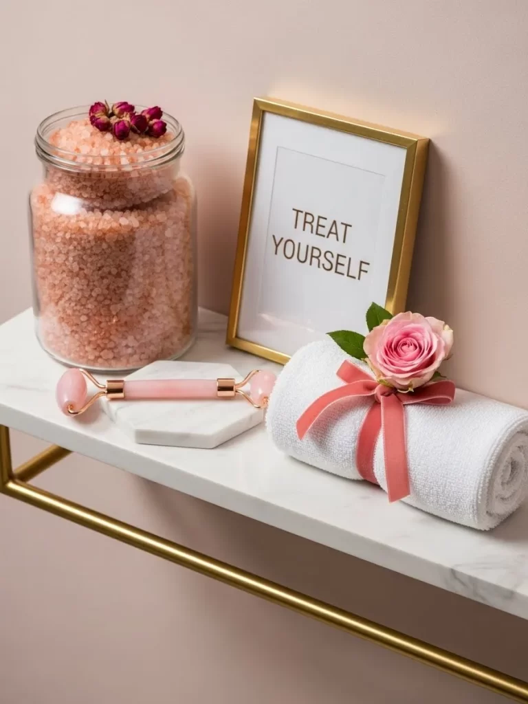 A white marble shelf holds a jar of pink bath salts and a rose quartz roller. A small gold frame displays a card that says TREAT YOURSELF. A white towel is rolled up and tied with a pink velvet ribbon and a rose.