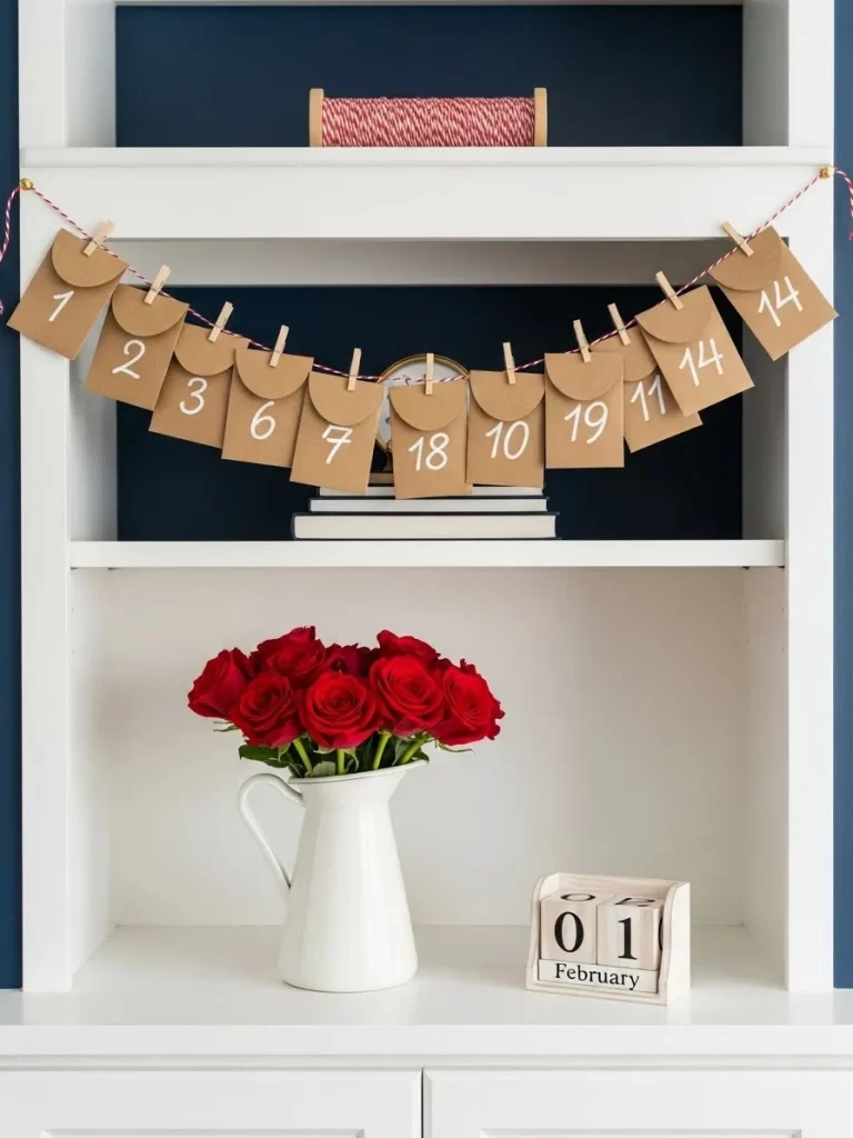A white shelf displays a garland made of small brown envelopes. Each envelope has a white number from one to fourteen written on it. A white pitcher full of red roses sits on the bottom level.