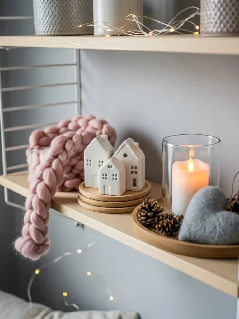 This light wood shelf features a clean Scandi inspired look. Three small white ceramic houses with window cutouts sit on a stack of round wooden coasters. A thick pink chunky knit blanket is draped casually over the left side.
