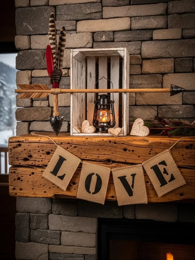 A rough wood mantelpiece serves as the foundation for this cozy display. A burlap banner with bold black letters spelling LOVE hangs across the front. Above it a decorative arrow with feathers rests horizontally.