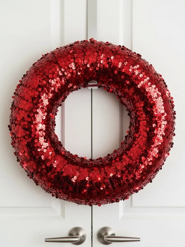 Dozens of red sequins cover this entire wreath for a high shine and festive look. The deep crimson color sparkles brilliantly even in low lighting. This sleek and simple design feels very modern and sophisticated for your entry.