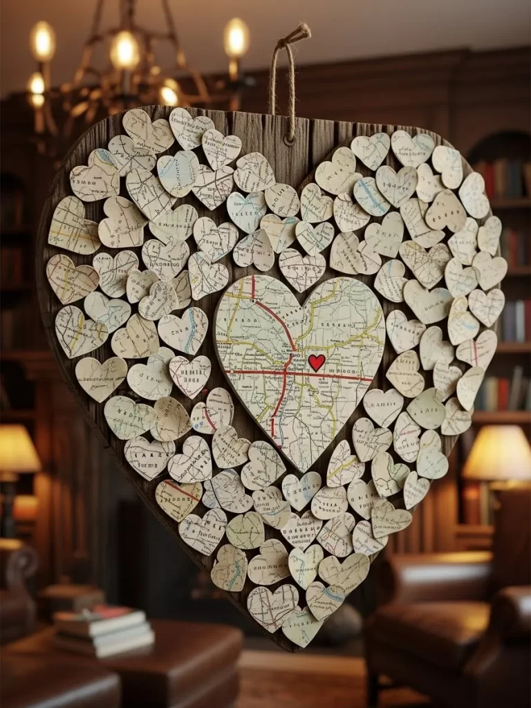 Tiny paper hearts cut from vintage maps cover a large wooden base for a nostalgic feel. This unique design tells a story of travel and shared adventures with your partner. Natural wood tones provide a rustic backdrop for the aged paper textures. You could use maps from places you have visited together to make it even more special.