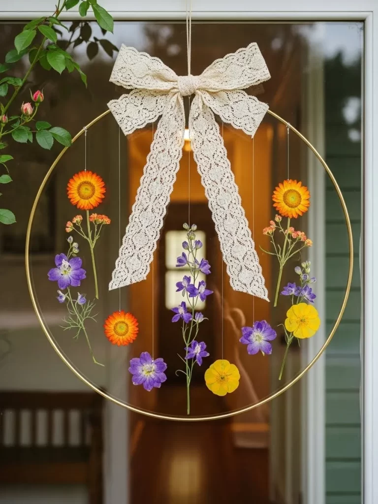 Bright dried flowers seem to float within this delicate gold hoop. Thin strings hold the blossoms at various heights for a magical effect. A wide lace bow sits at the top to give the piece a vintage feel. This design looks airy and light against a glass door.