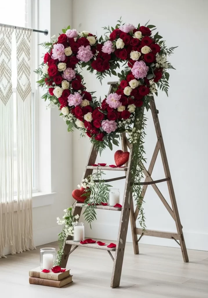 Transform an ordinary wooden ladder into a stunning focal point for your home this February. This decoration uses a large heart shaped wreath filled with lush roses and peonies to create a romantic atmosphere. Soft pinks and deep reds pop against the rustic wood of the ladder.