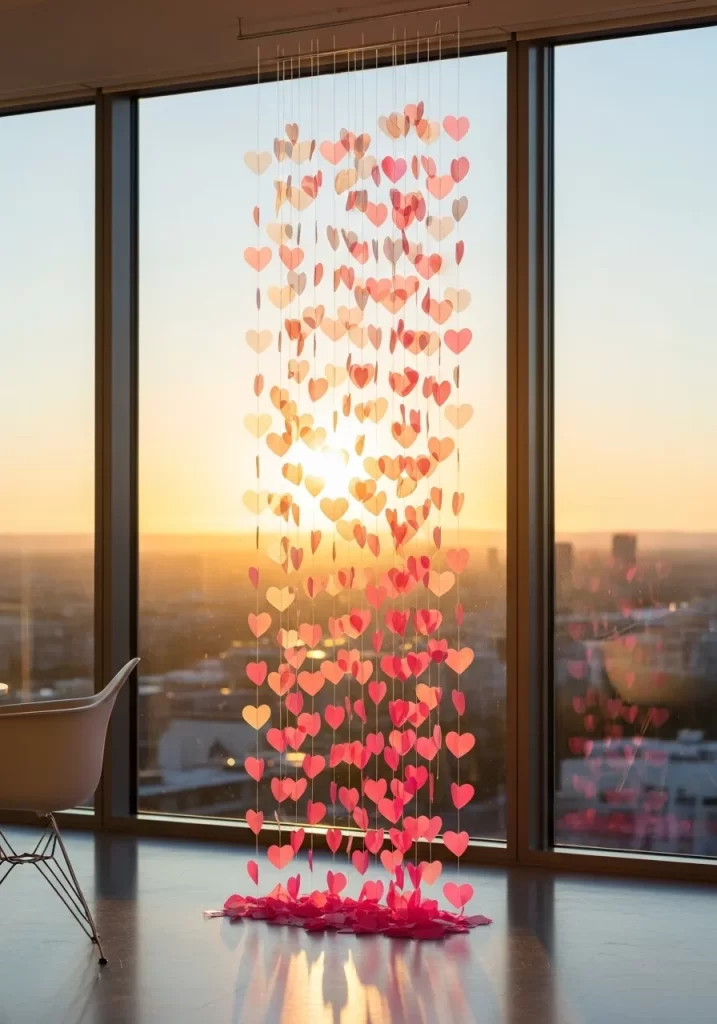 Add height and color to your window with a vertical string of paper hearts. This project uses honeycomb paper balls in shades of red, pink, and peach to create a playful 3D effect. The light from the window catches the paper edges, making the colors glow.