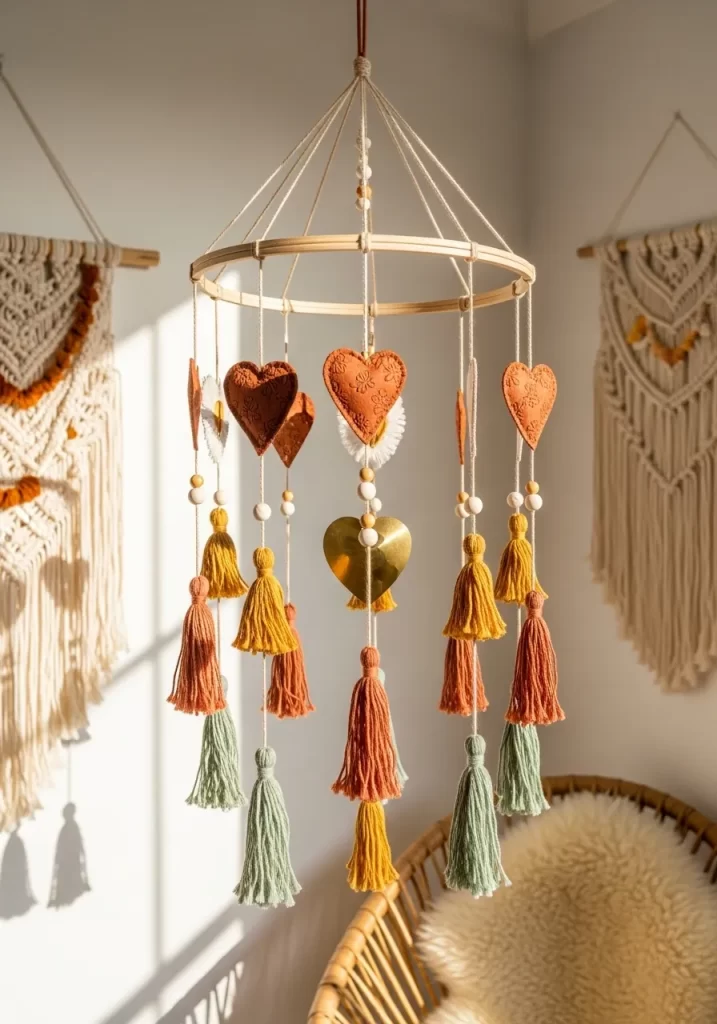 - Loop the top of these strings over the horizontal twine lines and glue them in place so the hearts hang at different heights.