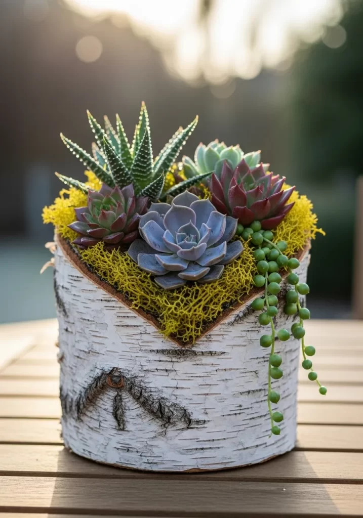 Bring an earthy, rustic vibe to your outdoor space with a planter made from natural birch bark. This design features a heart shaped cutout in the side of a birch log, filled with vibrant green and purple succulents. The white bark provides a stunning contrast to the lush colors of the plants.