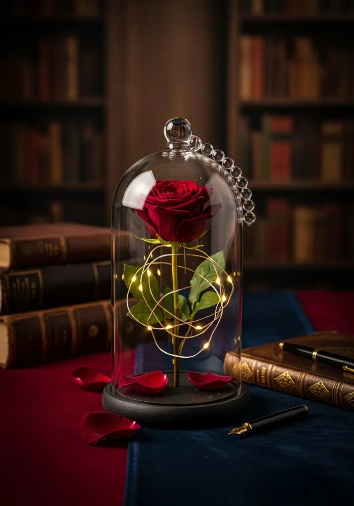 - Carefully lower the glass dome over the rose, ensuring no wires are pinched.