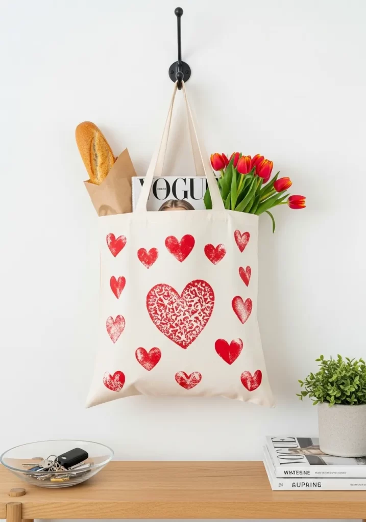 Add a touch of handmade charm to your daily errands with a custom stamped canvas bag. This project uses various sizes of red heart stamps to create a scattered, artistic pattern across a plain tote. The large central heart features an intricate lace like texture that serves as a focal point.