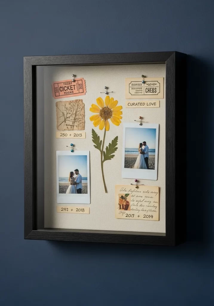 Preserve your most cherished moments in a sophisticated black shadow box display. This project combines personal photos, ticket stubs, and pressed flowers to tell a visual story of your relationship. Hand labeled dates and locations add a curated, museum like quality to the piece.