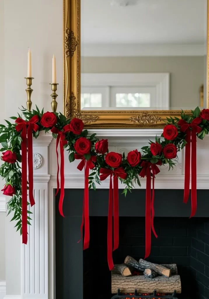 Frame your fireplace with a lush greenery garland woven with deep red roses. This decoration brings a high end, classic feel to your living room. The long red velvet ribbons hanging from the mantel add movement and a soft texture to the display.