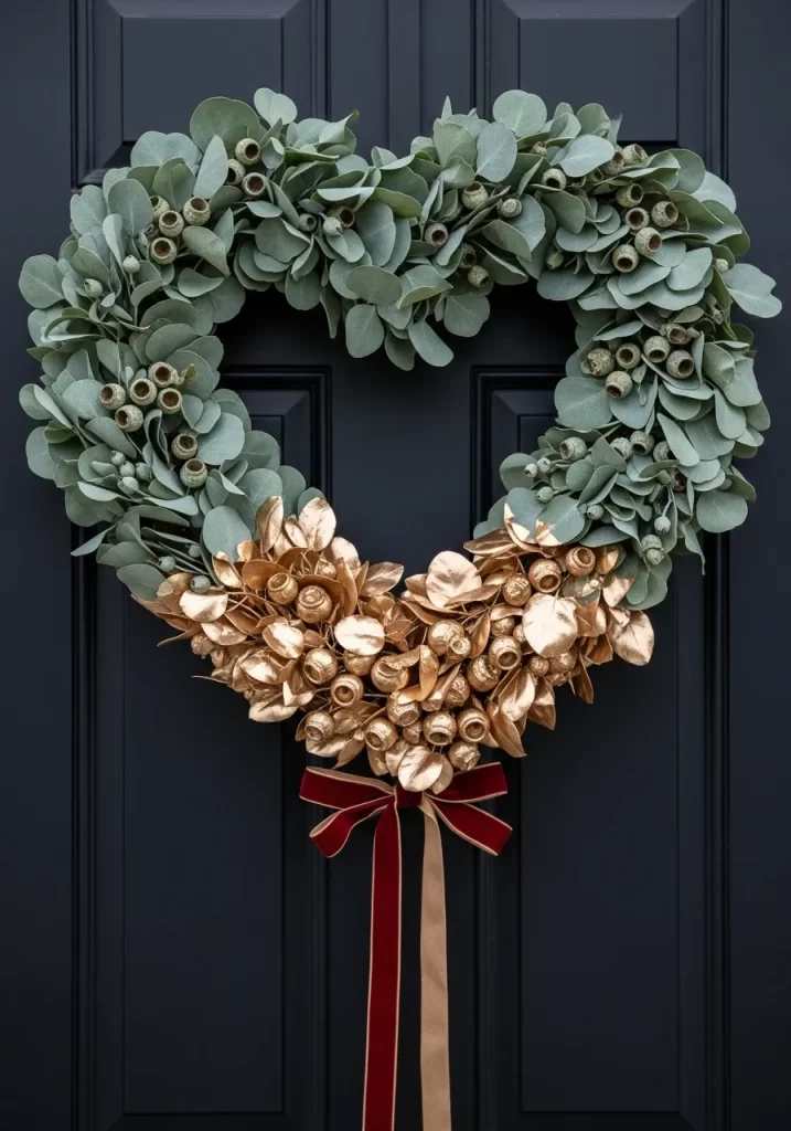 Tiny red glitter hearts peek out from the greenery to add a hint of sparkle. It offers a stylish alternative to traditional floral wreaths. The contrast between the dark door and the bright sign ensures your home stands out on the block. It invites guests into your home with a sweet and trendy message.