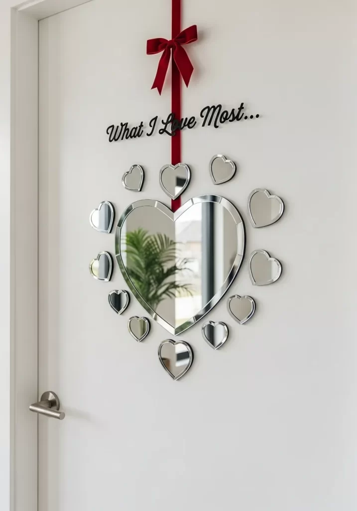 - Place the smaller mirrored hearts in a circular halo pattern around the main mirror.