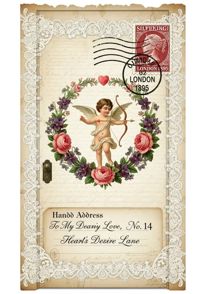 A classic cherub holding a bow is centered within a floral wreath of roses and violets. The bottom section features a handwritten address to a loved one, adding to the old world charm. A large red London stamp provides a historical focal point at the top. This is an incredible choice for history buffs or fans of the dark academia style. It is nostalgic, romantic, and deeply detailed.