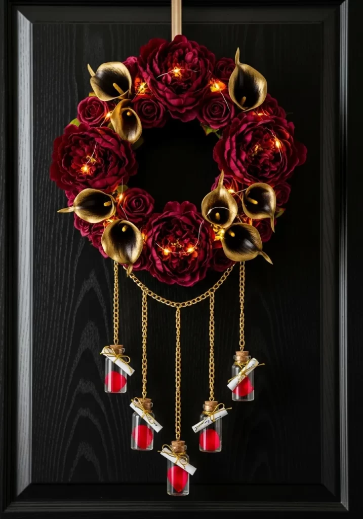 Delicate fairy lights are woven throughout the petals to offer a soft, magical glow during the evening. Five small glass bottles hang from golden chains at the base, each containing a rolled parchment for secret love notes. It is a poetic decoration that combines visual beauty with a personal, interactive element.