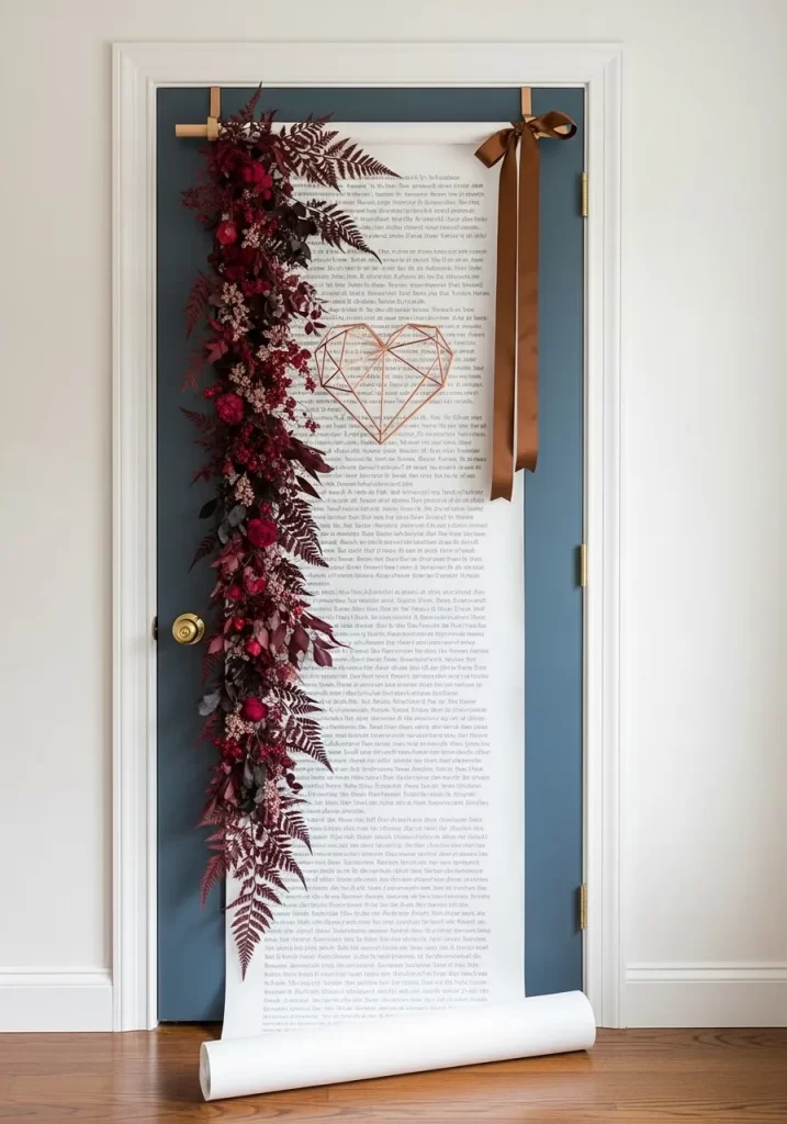 Make a grand, literary statement with this unique vertical scroll installation. A long roll of white paper drapes from the top of the door to the floor, mimicking an unrolled love letter. A sprawling cascade of deep red ferns and roses runs down the left side, adding a natural and romantic frame.
