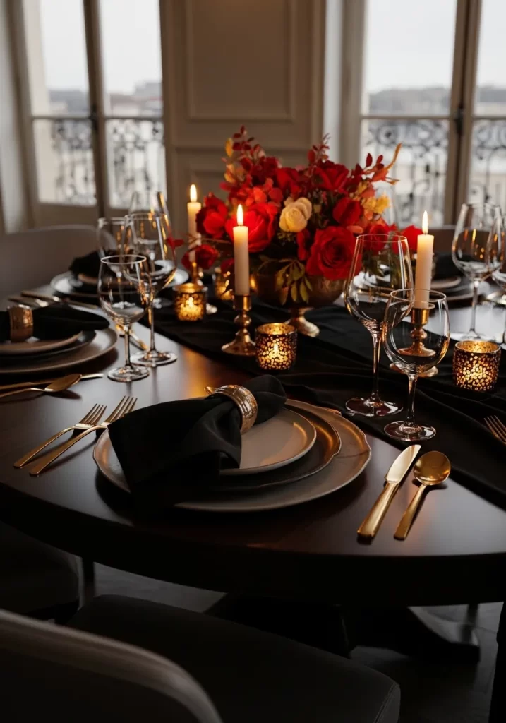 Setting a dark runner across a wooden table grounds the space. It allows the red roses to pop as the focal point. Every piece of cutlery and glassware reflects the soft flames, ensuring a cozy yet sophisticated environment for your meal.