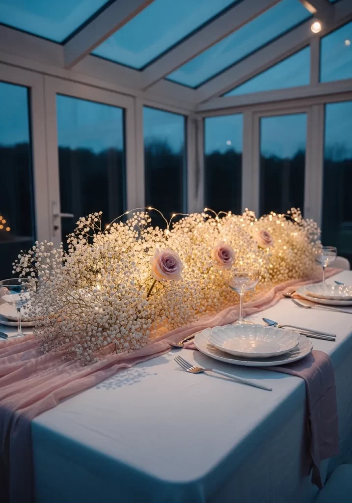 A dusty rose fabric runner adds a gentle touch of color beneath the white flowers. Simple white plates and clear glassware keep the focus on the luminous centerpiece. This setup feels light and airy, making it a wonderful choice for a romantic conservatory setting.