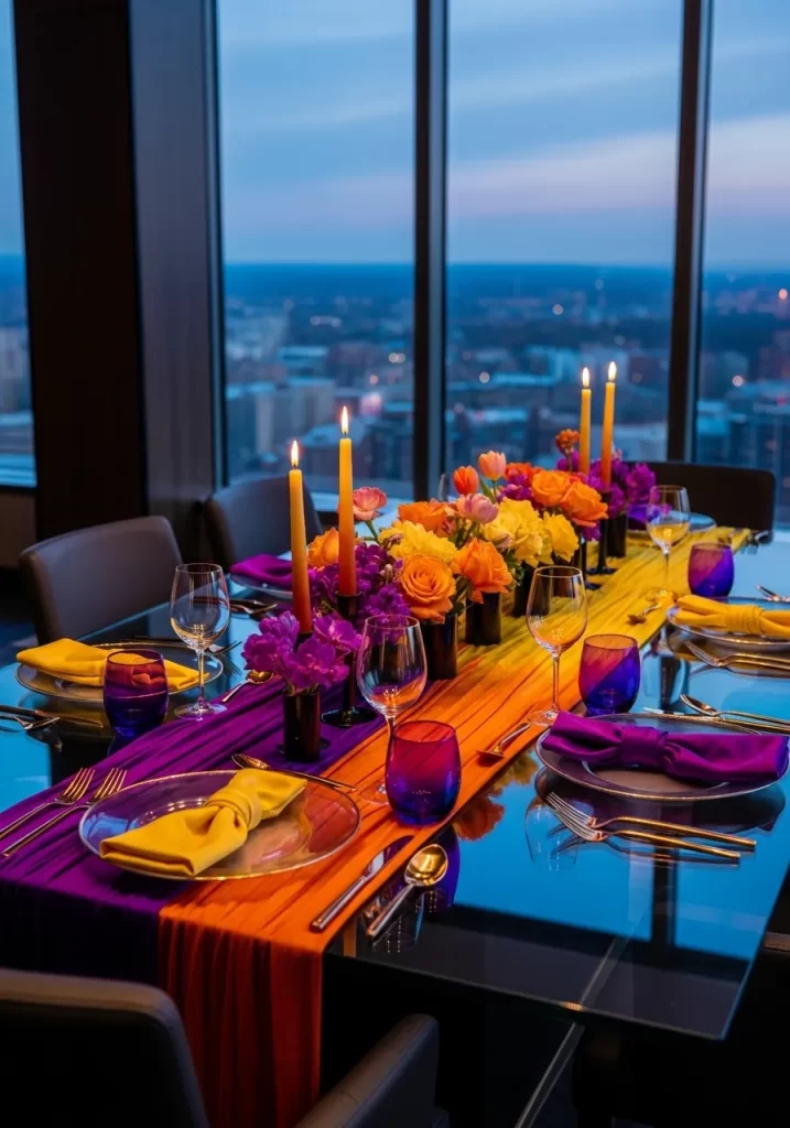 - Lay the purple and orange runner across the table so the colors blend in the center.