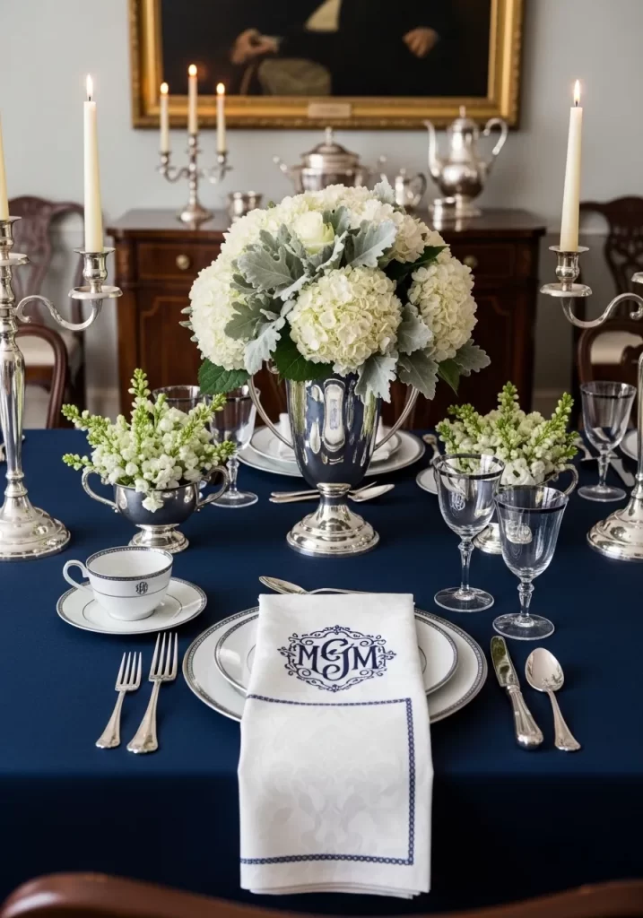 Classic and dignified, this design uses a formal color palette of navy, silver, and white. A deep navy tablecloth provides a sober base for polished silver trophies and candelabras. Large mounds of white hydrangeas and dusty miller create a sense of timeless elegance.