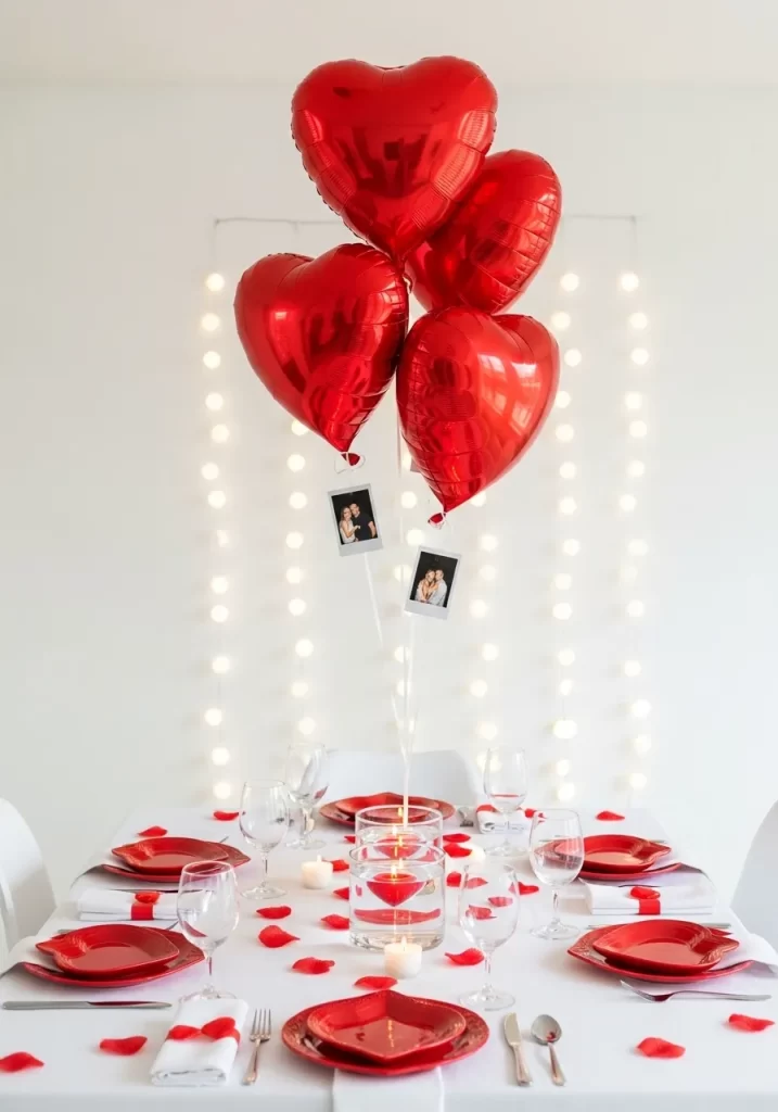 Airy and whimsical, this design uses vertical space to create a sense of joy. Four red heart-shaped foil balloons float above the center of the table, holding personal photos. A background of warm white string lights adds a soft, glowing curtain effect to the room.