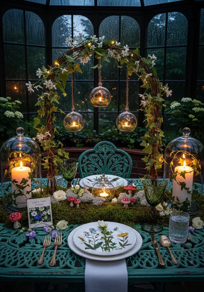 Nature takes center stage with this grounded and earthy tablescape. A potted rosemary plant shaped into a heart provides a fragrant and symbolic centerpiece. The wooden table and stone walls offer a warm, old-world charm that feels both intimate and timeless.