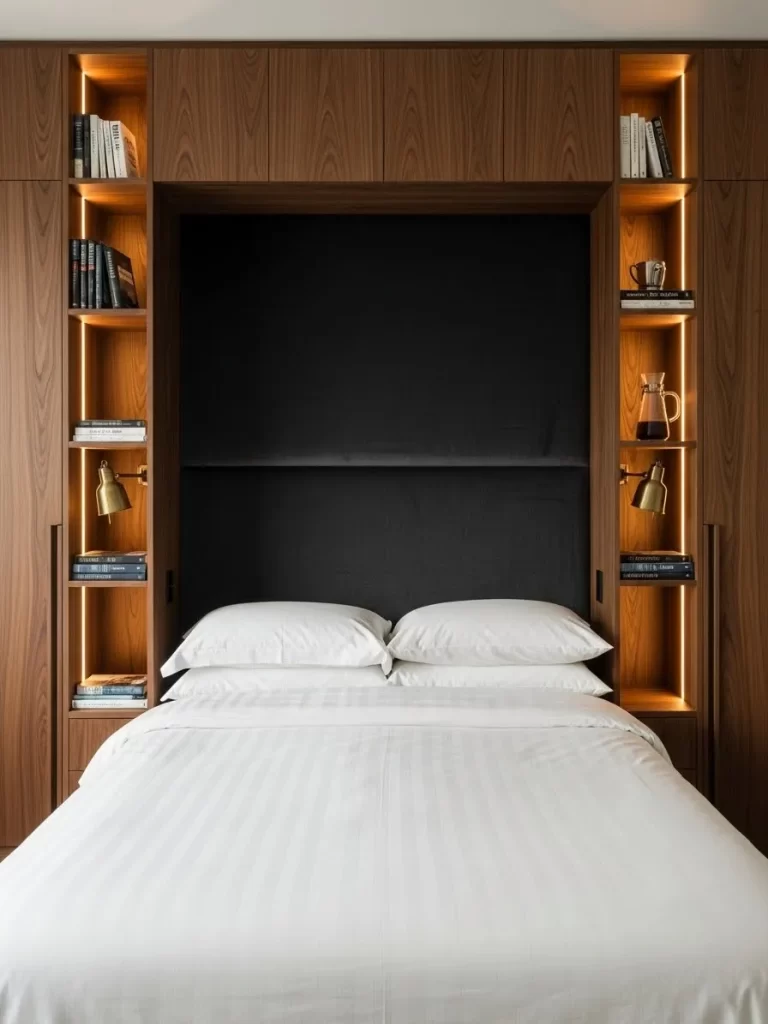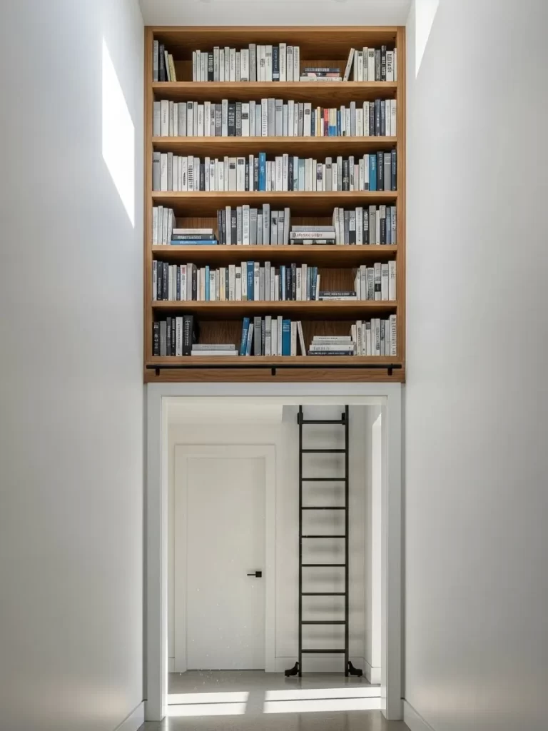 Empty wall space above a doorway often remains forgotten and unused. This clever design turns that blank area into a sophisticated home library without taking up a single inch of floor room. The warm wood tones contrast beautifully against the crisp white walls, creating a focal point that draws the eye upward and makes the ceiling feel much higher.