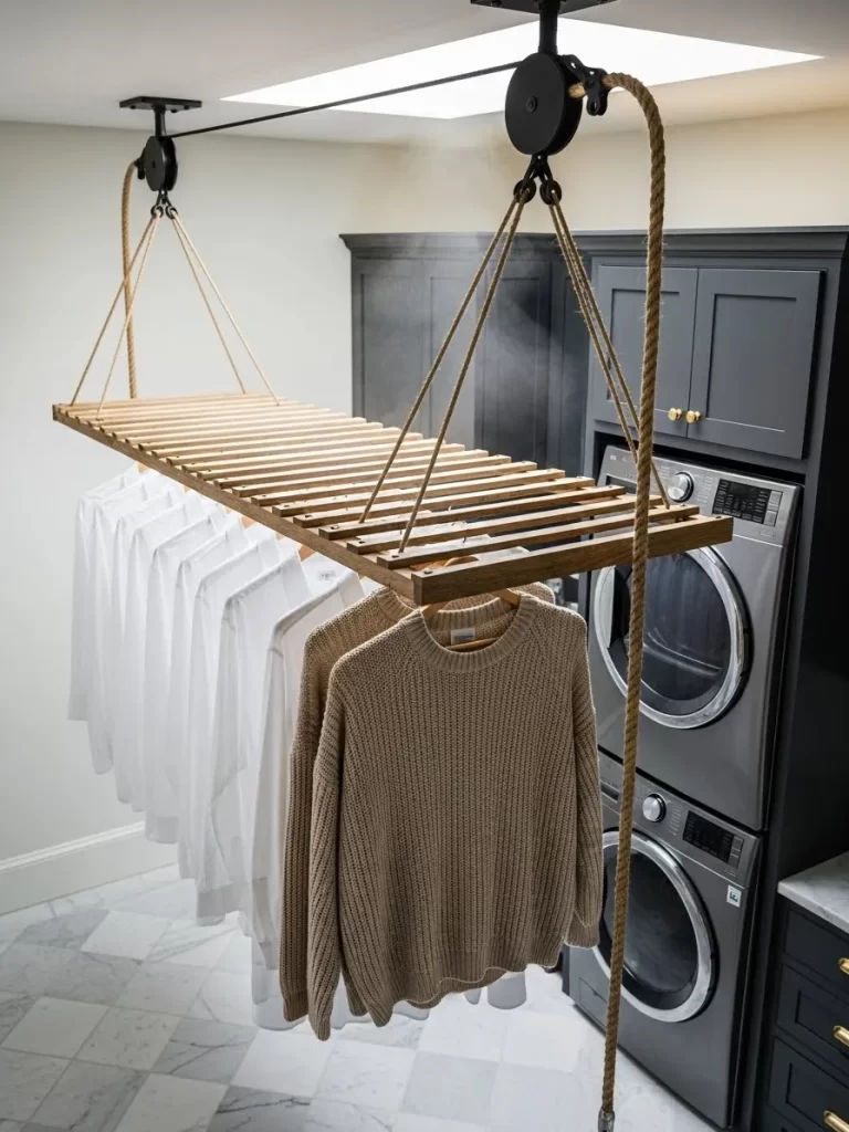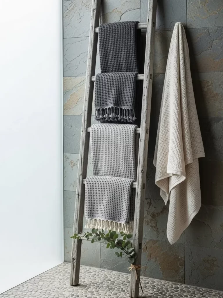 Bathrooms often lack enough wall hooks for a full family’s worth of towels. This vertical towel ladder leans against the wall, providing multiple rungs of storage in a very narrow footprint. The weathered grey wood adds a rustic, spa like texture to the room while keeping linens dry.