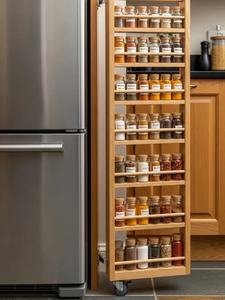 Most kitchens have a tiny gap between the cabinets and the wall that simply collects dust. This vertical storage solution utilizes that sliver of space to house a folding step stool. The custom fit bracket keeps the stool upright and hidden, ensuring it is always nearby when you need to reach high shelves.